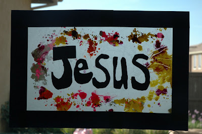 In bible we're learning the names of Jesus.  It's amazing because the girls are in a play at church this semester and it's also about the names of Jesus.  Super exciting for them!  They made these neat Jesus window posters and they are now hanging in our living room windows.